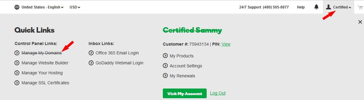Manage my domains option under godaddy account